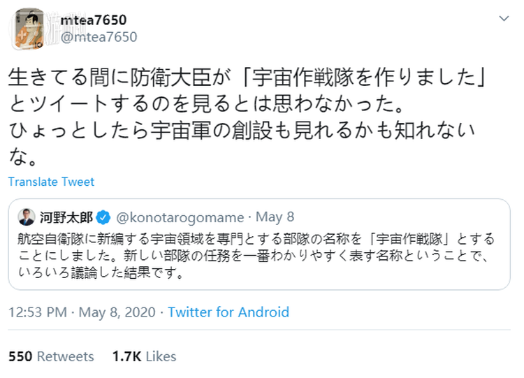 所以到了“科幻成真”的现在,不少人都感到难以置信。甚至有日本网友表示:“没想到我在有生之年居然能看到防卫大臣在推特上发‘宇宙作战队成立了’的这一幕,是不是以后还能看见宇宙军的成立”。