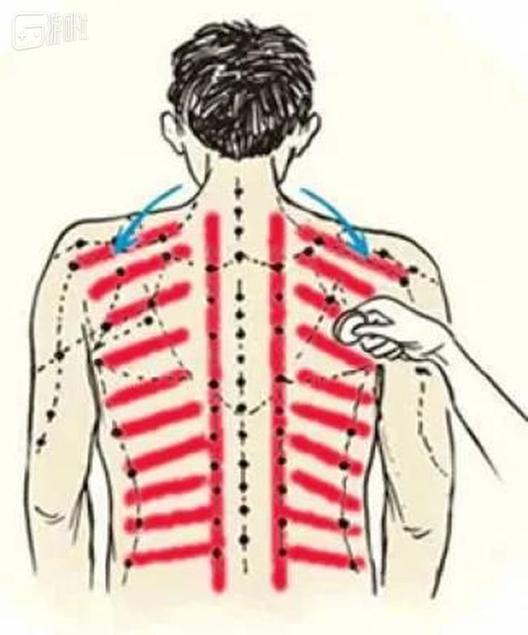 这种刮痧的特点在于刮出来的痧是线状的,这些线的排布是有讲究的,不是乱画的,一般是从上至下等间距的刮出两扇排骨。