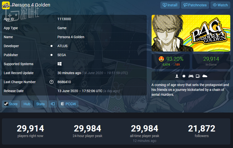 2020年6月14日,《女神异闻录4黄金版》在Steam平台正式开售,同时在线人数将近3万人。这天也是《女神异闻录4黄金版》作为PSV独占游戏发售的8周年纪念日,这么多年来P4G始终都是PSV上最值得玩的游戏之一,甚至是很多玩家购买PSV的主要原因。这次移植,让PSV失去了为数不多的存在意义。