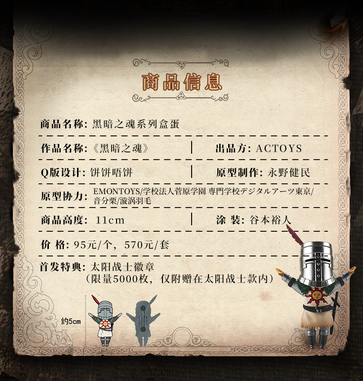 由万代南梦宫授权,ACTOYS设计的《黑暗之魂系列盒蛋》在我们的淘宝店上架了。一套6款盲盒,角色随机获得。大家可看看下方的实物图。