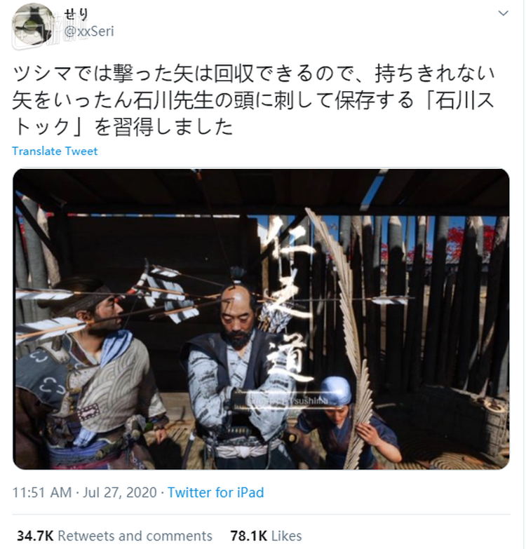 因为《对马岛之魂》中玩家能够收集的弓箭有限,为了营造出更夸张的场景,还有玩家想出以头部中箭这样的办法来收集更多箭头: