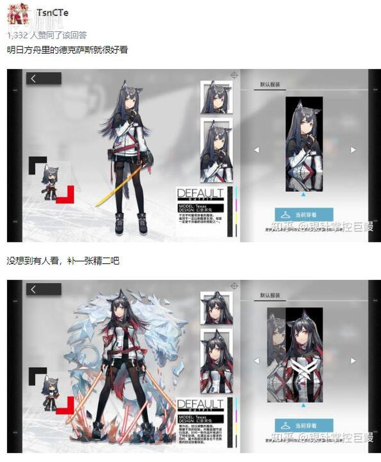 《明日方舟》在角色的立绘设计上也可谓用心,虽然闹出过“夜魔”这样的立绘“不走心”事件,但参考FGO高桥庆太郎的那些立绘来看,我们无法对画师的审美与风格进行样板化制约。舟游的画师启用的都是国内与海外一线,在开服与周年的宣传策略来看,官方也力图通过这些画师的影响力,以微博抽奖等形式来对游戏进行圈内的垂直传播。从传播效果来看,舟游的角色也确实在一定程度上出圈了。在知乎的一则高人气讨论穿搭的问题“黑丝袜真的不能搭配运动鞋吗?”中,一条用舟游角色“德克萨斯”举例的答案在众多美女晒图中脱颖而出,得到了高位的赞同。(虽然用二次元人物的立绘来回答实际生活中的穿搭这样的问题可能缺乏参考性。)