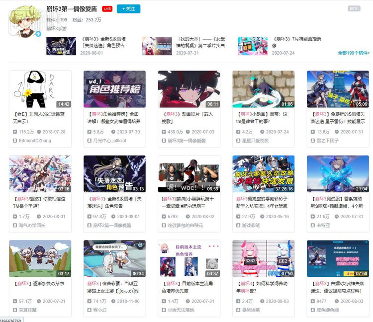 在平时水群的过程中,我观察到了一个非常有意思的现象:那就是崩三的玩家群体非常乐于向外分享游戏中的一些新鲜新闻的,比如新角色,新表情包,圈内的梗....你经常会在大群中看见一个群员在群聊中突然分享了一个崩三相关的内容,如果没有玩过的人大概率会选择无视掉,但是这也的无视也似乎丝毫不会影响他下次分享的热情。同样的案例也发生在贴吧等其他社区中,每当游戏更新,B吧主页都会冒出一票崩三相关的帖子,帖子中玩家们会热情的相互讨论、玩梗。这与其他手游讨论帖内动不动就引战互相攻击玩家群体的情况完全不同。B站也是崩三玩家们交流最多的阵地之一,在B站搜索“崩坏3”关键字,你会发现每天都会有不少投稿,并且相关的稿件播放量还很高。