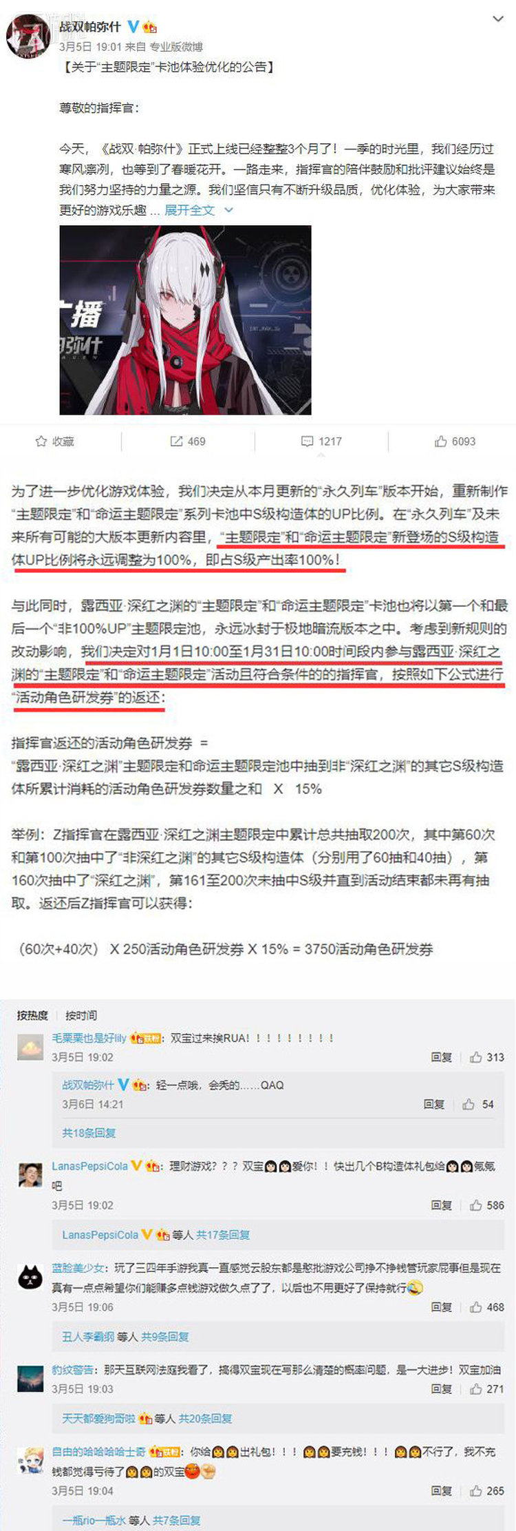 2020年3月5日,经过几次玩家关于出货率的炎上之后,《战双帕弥什》宣布了对其卡池的优化调整。在调整中,新登场S级角色的出货比率上升至了100%,即60回必出当期up的保底。同时还对上一个活动抽取角色符合条件的玩家进行了黑卡补偿。其实很多二次元手游都有保底,或者“井”这样的概念,只不过与其他游戏的100抽保底或是300抽“井”相比,60抽这样的“低成本”对于许多玩家来说就显得非常亲民了。