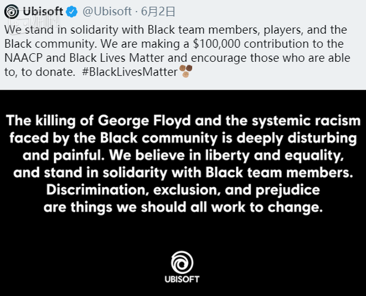 而几个月前,育碧还曾为BLM捐赠10万美元以表对这场平权运动的支持,收获了玩家好评。