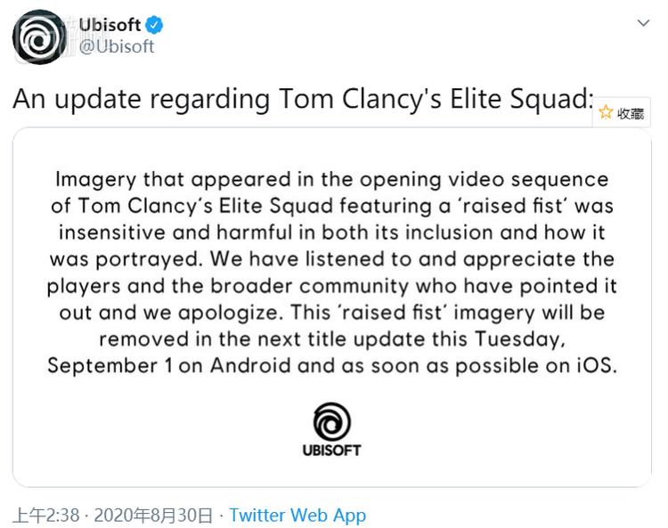前日,育碧在自己的官方Twitter上发布了一则简单的更新声明。而这则更新声明,是关于育碧刚刚上线的手游《汤姆克兰西:精英小队》(Tom Clancy's Elite Squad)的。