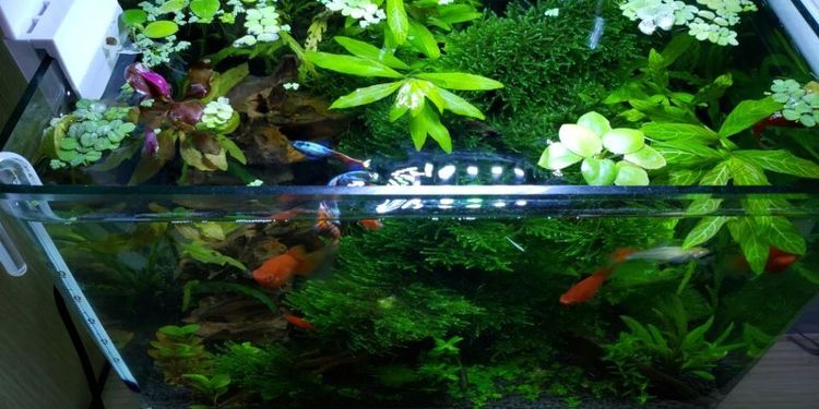 第一次涉足水族,我嫌麻烦直接花两百多买了个成品缸,里面有些青龙石和莫斯树造景,加上5条斑马鱼,10条红绿灯,10条黑壳虾,啥都不用操心,抱回来立等可用。