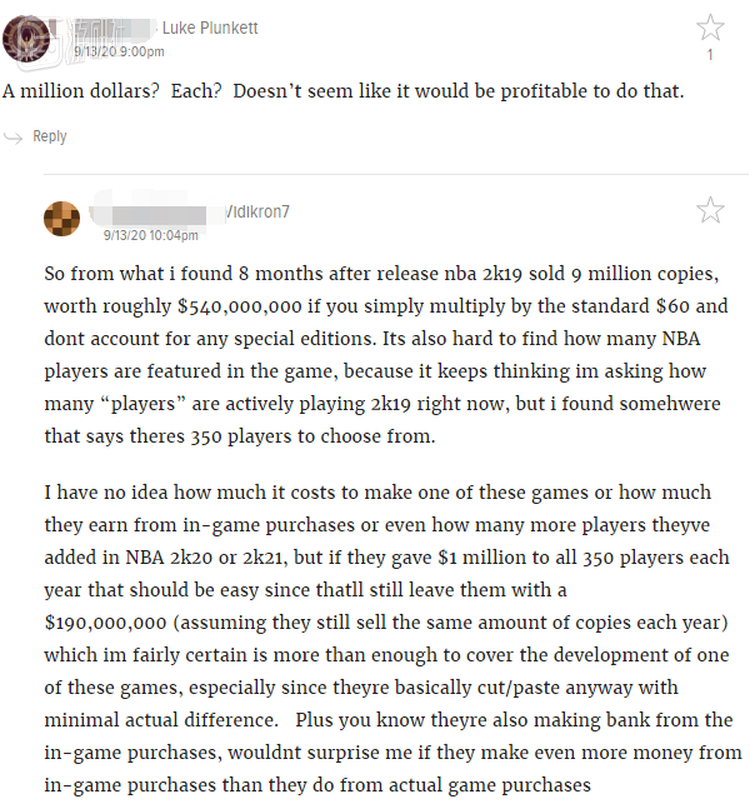 不过这样的提议还得到了不少美国网友的支持。有人还算了一笔账,认为以2K Sports每年通过《NBA2K》获得的收入,完全足以支付这样的金额: