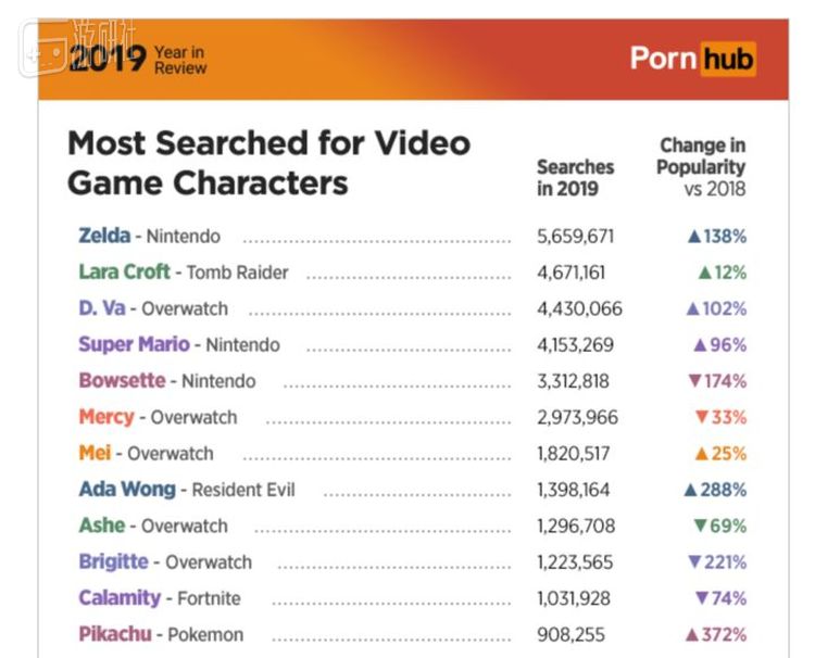 要知道,国外著名色情网站Pornhub,每年都会对网站的搜索结果数据进行统计,而任天堂游戏的角色年年榜上有名。