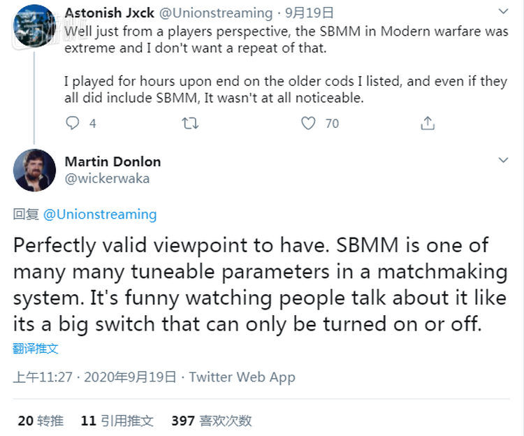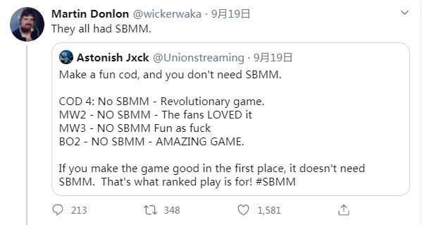 一位玩家发推特表示,《使命召唤》的几部系列前作都没有SBMM,玩起来很快乐。很快,《使命召唤:冷战》制作组Treyarch的技术总监就出面予以反驳,称《使命召唤》系列的前作都使用了SBMM机制。