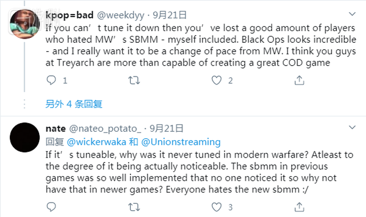 即便官方开发人员如此无情,推文下方请愿改变SBMM机制的玩家还是络绎不绝,只不过措辞从“取消SBMM”变成了“调整SBMM参数”。