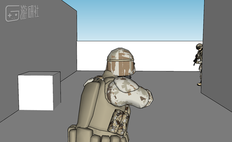 如果想平衡这一场景,有很多方法。最简单的是给该空间内对称位置放置一个相同的掩体,只要保证玩家进入掩体的时间相等,空间对称就一定是绝对平衡的了。但是在大多数游戏的设计中,往往不会采用这样简单粗暴的方法。因为这既不真实,又容易造成玩家对方位的迷惑。