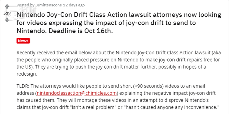 针对任天堂的诉讼发起于去年7月。在今年的国庆假期,处理Joy-Con一案的美国CSK&D律师事务所才开始与消费者接触,以邮件的形式要求他们提供简短的陈述与视频。根据Reddit上的反馈,邮件中有提到,任天堂认为摇杆漂移“不是一个真正的问题,没有为任何人带来任何不便”。