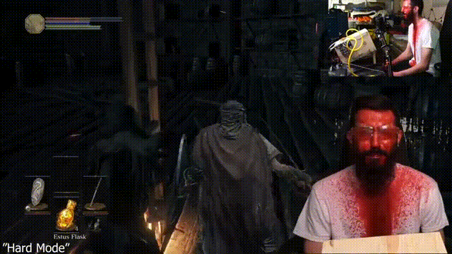 对于早就已经看腻了在受苦游戏《黑暗之魂》里花式炫技的观众来说,没见过的新奇游戏玩法才能有足够的吸引力——比如在黑魂里挨打,就会惨遭血浆洗脸这种事。