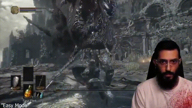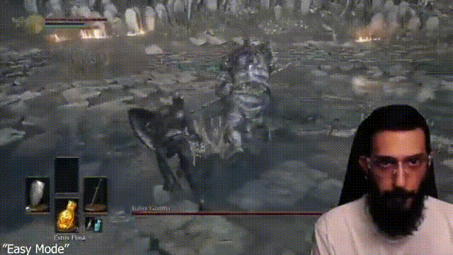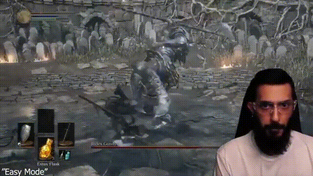打完古达,简单模式的新手试炼就算完成了。但切换到困难模式之后,他很快就遇到了第一个敌人,一位暴躁的不死人——这位不死人在初次见面就送上了一套猛烈的连招,让他迅速结束了当晚的战斗。