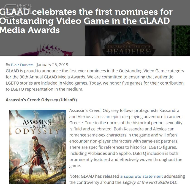 去年育碧推出的《刺客信条:奥德赛》DLC“暗影后裔”中,强制令主角与异性结婚产子曾引发了大量玩家的不满,反应迅速的育碧迅速低头认错,并在随后更改了这一设定。凭借这一举措,《刺客信条:奥德赛》还获得了当年的同性恋反歧视联盟的“杰出游戏”奖项提名。