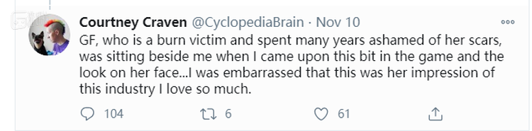 但让Courtney Craven发出那样的感慨其实是有原因的。按照他自己的补充,Courtney Craven是在和一位同样是被烧伤过的、且一直为自己的伤疤感到难受的伙伴玩游戏的时候,一同看到的上面这段描述。“当时我玩到这里时她正坐在我旁边,我能看到她脸上的表情.......我感到很尴尬,这是她对我所深爱的行业所留下的印象。”