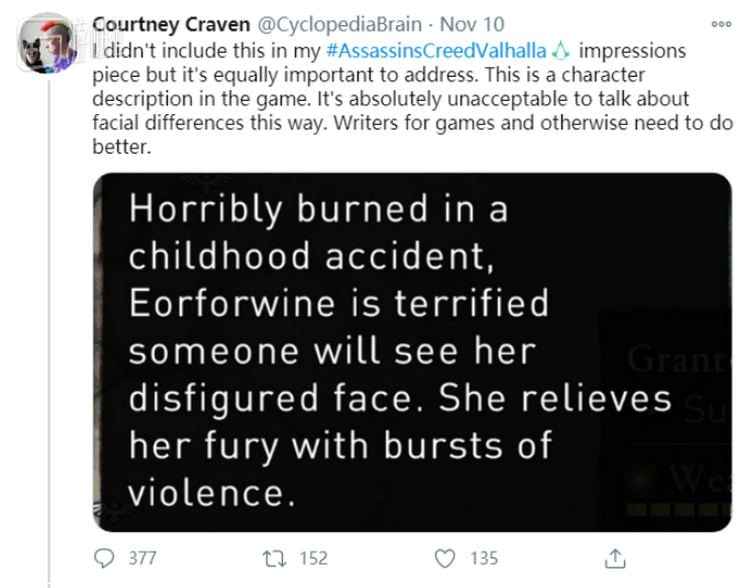 不过最近,有人对《刺客信条》新作中的某些细节处理表示了不满。比如下面这段来自游戏中的文本:“因为孩童时期的吓人烧伤,Eorforwine害怕别人看她毁容的脸——她借用暴力来平息她的愤怒。”