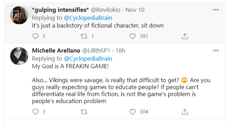 “天哪,这只是个游戏啊!再者维京人的确是野蛮人,这很难理解吗?你们真的期待用游戏来教育人吗?”