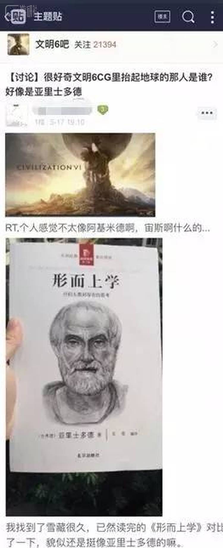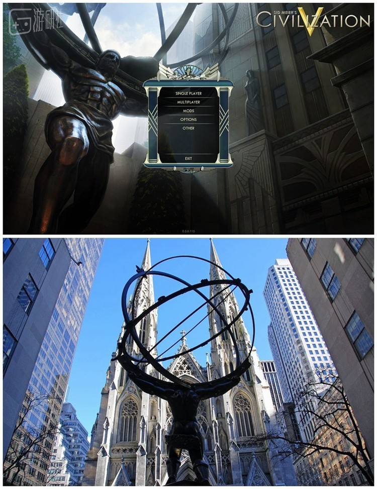 这个画面被部分玩家戏称为“顶个球的人”。类似的场景其实在《文明5》中就已出现于主菜单的背景画面,青铜巨人以臂膀擎起巨大球体。