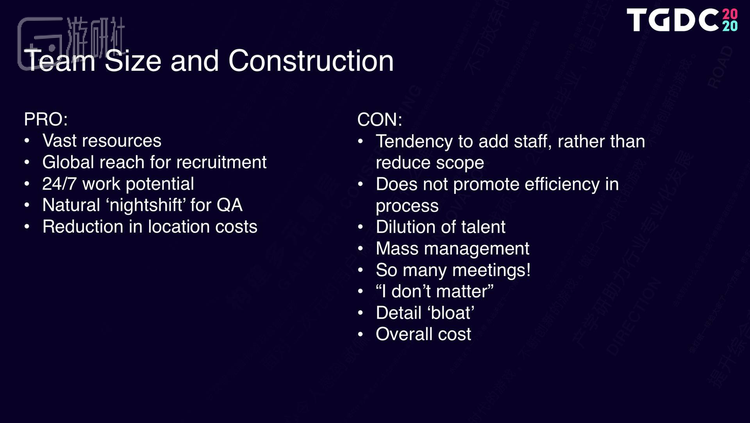 6. 个体可能会变得不再重要。举个例子,如果你是团队的2%(即一个50人的团队),那你一定对项目很有参与感,很有主人翁精神,你和同事也都彼此认识;但如果你只是团队的0.18%(即一个500多人的团队),那你可能最多只认识15%的同事,对项目可能也没什么热情——这对于游戏开发可不是什么好事,而且就在我身边真实发生过。
