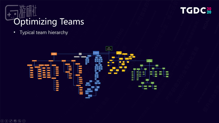 举个例子,这是一个最典型的3A游戏团队组织结构,我给不同的团队加上了颜色,方便辨认。