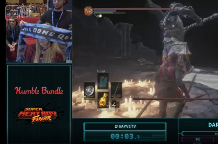 同年AGDQ速通大会上(Awesome Games Done Quick),女主播Sayvi也曾表演过闭眼打黑魂的绝技,分别以25.1秒与24.0秒的成绩击杀boss古达和教宗沙力万,技惊全场。