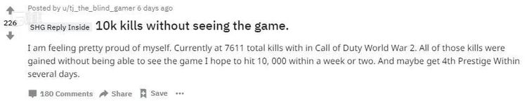 来自美国的tj the blind gamer也在2018年完成了《使命召唤14:二战》中的7600个击杀。