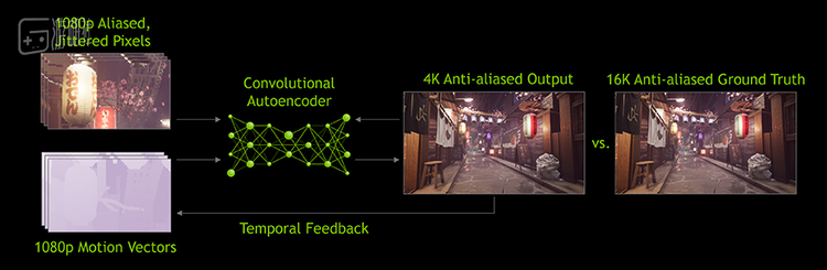 首先,NVIDIA会利用超级电脑来训练这个AI,让AI不断练习将低分辨率的图像修复为高清图像,然后和预渲染的超高清16K参照图进行对比,将修复结果中的不足将反馈给AI,并进行优化。就这样进行无数次的练习,最终AI生成的图像和原生图像已经非常的接近。
