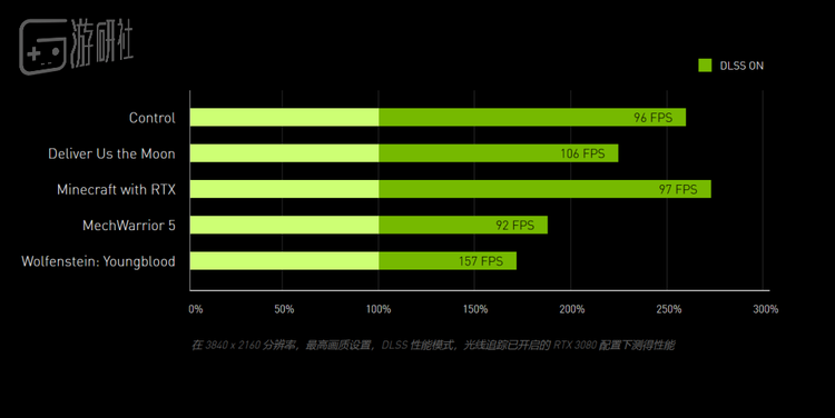通过这样一个方案,DLSS给玩家带去的最明显的实惠,是游戏帧率的显著提升。因为GPU渲染的分辨率实际要比屏幕显示的分辨率低几档,计算的压力大大减少,而有更多的性能来让游戏运行得更加流畅,根据游戏的不同能提升十几帧到几十帧不等。