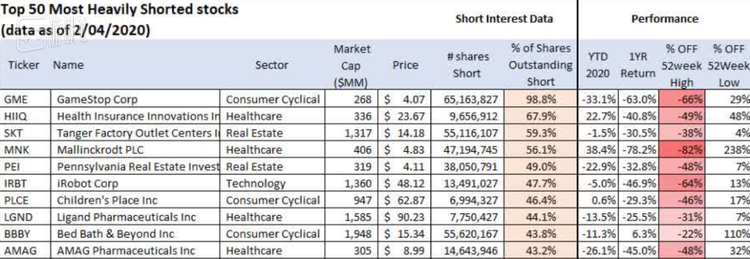 截止至2020年4月,美国股市中被做空比例最高的前十名股票