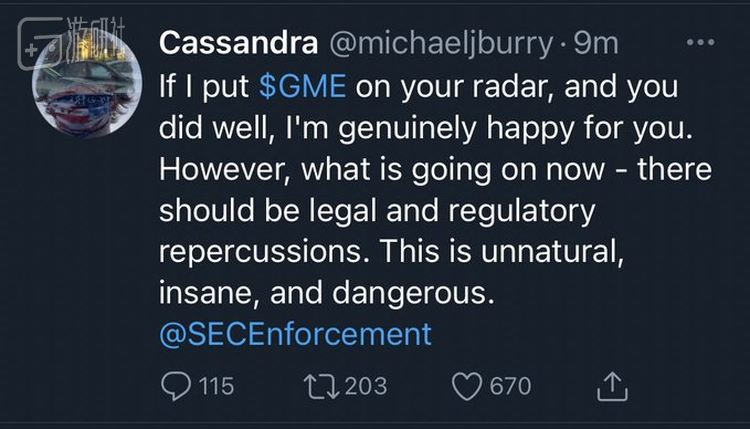 然而他并不认可正在发生的这一切,称其为“不自然、疯狂、危险”,呼吁监管机构介入。这让他在散户间的声望一瞬间由“教父“沦为“叛徒”“资本的走狗“,在评论区里对他恶言相向。最终,贝里医生清空了他的推特账号。