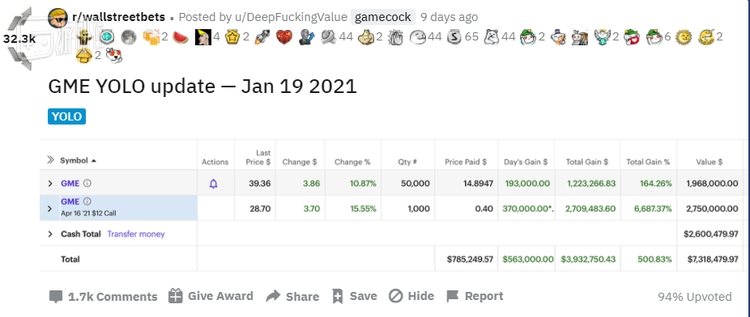 经过了上一周的鏖战,此时DFV的账户资产已经高达700万美元,并表态将继续持有GME。他本人已然成为这场大战里散户一方的图腾和精神领袖,“Hold $GME”成为了版里的新口号。如果说之前购买GME的散户大多还是冲着轧空机会有利可图加入的,此时坚持持有GME则愈发成为一种信仰。