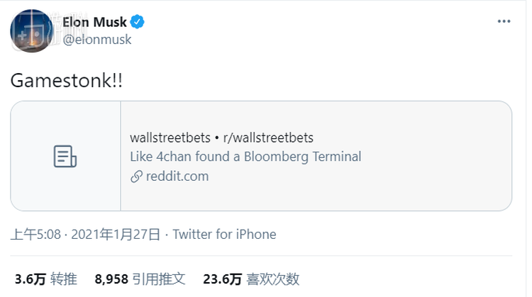 他的对头艾伦马斯克(贝里长期做空特斯拉)则恰恰相反,仅仅是转发WSB的网址并高呼一句“GameStonk”就获得了十万加点赞,成功推波助澜。