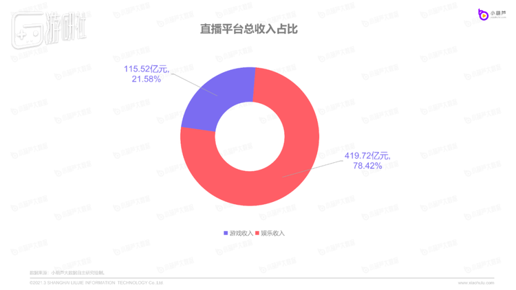 2020年,全平台游戏直播礼物收入占比21.58%,约1/4;其他娱乐分类的礼物收入共占比78.42%。