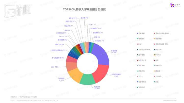在2020年收获直播礼物收入最高的前100名主播中,《王者荣耀》主播占比21.25%,《梦幻西游》PC端游主播占比17.5%,《英雄联盟》主播占比12.5%,《绝地求生》主播占比12.5%。