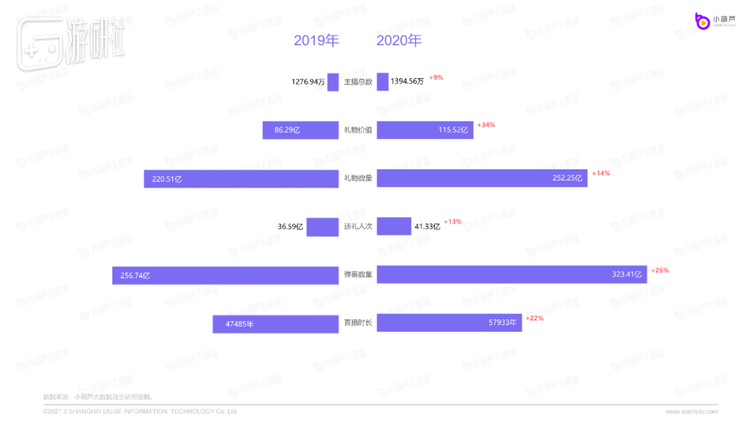 与2019年相比,2020年游戏直播的开播场次增长了9%,礼物数量增长了14%,全年送礼人次增长了13%,全年度的弹幕数量增长了26%,全年的直播时长增长了22%,数据增长十分显著。