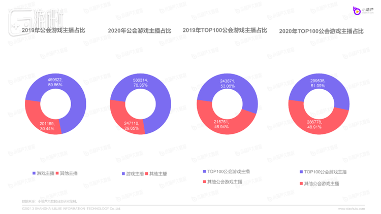 但与2019年相比,虽然游戏主播数增长了近6万人,但TOP100公会游戏主播的占比率同比下降了近2%,意味着许多微小型公会也在摸索模式中逐渐成长壮大,培训、招募了具有一定规模的新生代游戏主播。