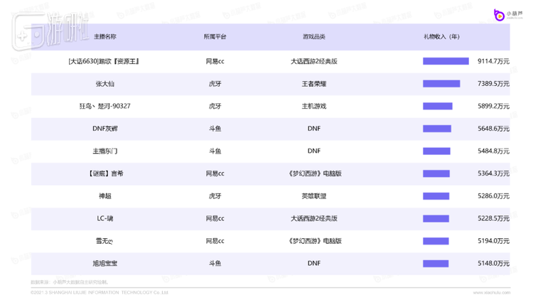 让人感到意外的是,其中只有张大仙和旭旭宝宝分别作为王者荣耀和DNF的代表,被广为熟知。而其他主播,几乎都来自于热度不那么高的游戏品类,比如大话西游2和梦幻西游电脑版。其中,大话西游2的主播踏歌『资源王』以其年礼物收入9114.7万元位列榜单第一。