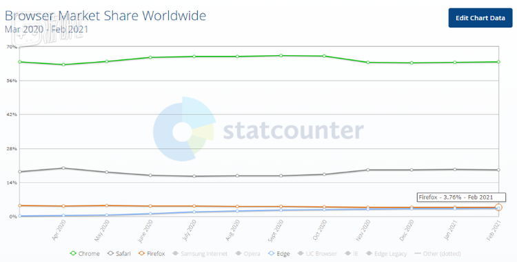 根据GlobalStats网站的数据,改头换面的Edge全球市场份额持续上升,自2020年1月的0.01%上升至同年12月的3.08%,再到2021年2月的3.41%。这一数据距离浏览器霸主谷歌(63.59%)还是差了十万八千里,但Edge已然有望竞争Firefox,即火狐浏览器的地位。