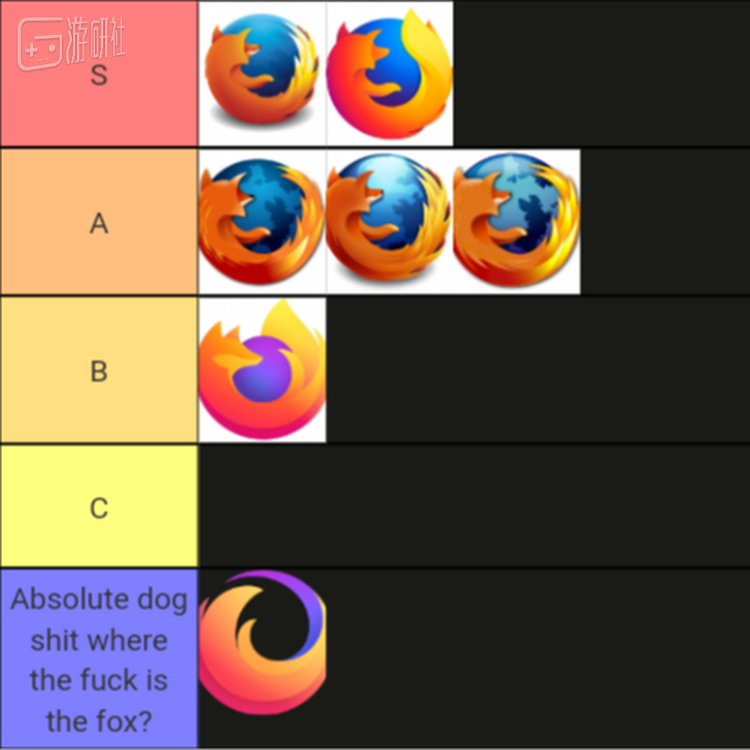 下面这张为历来的火狐商标打出评价的阶梯图,集中表达了他们的诉求。年代最久远的两款LOGO被评为了最优秀的S级,而最新的LOGO位列倒数第一,评语如下:“绝对的狗屎,狐狸到底去哪儿了?”