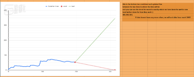 路德维格的Subathon开播没多久,他的几位老粉丝制作了一份在线表格,以半小时为单位,记录路德维格的直播间倒计时与订阅人数,并运用统计学知识制作趋势图,大致预测路德维格直播的结束时间。