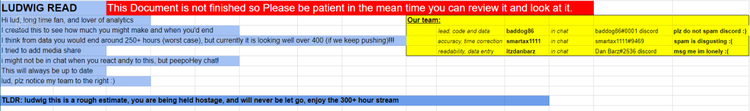 在表格的“太长不看版”一行中,一位粉丝标注道,路德维格是粉丝们的“人质”,而粉丝们绝对不会放人,“尽情享受300多个小时的直播吧”。