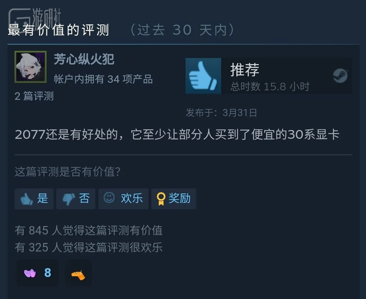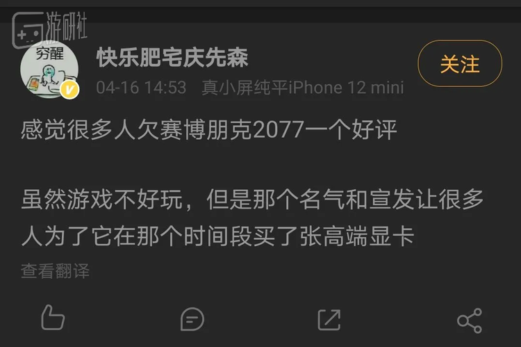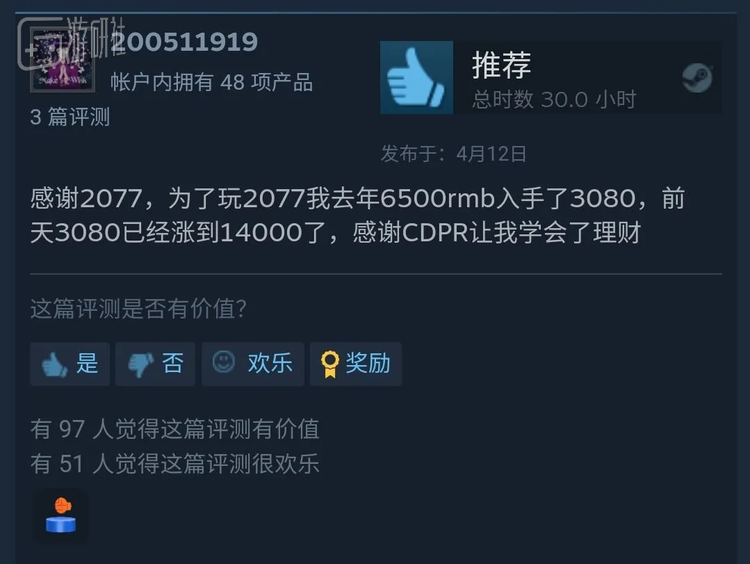 而且,我并不孤单。虽然我自己挺喜欢2077的,但是不能否认,在几个月前,这款游戏还是一些玩家心中的痛。甚至有人觉得,这游戏是CDPR和显卡厂商为了带货联手制造的阴谋。