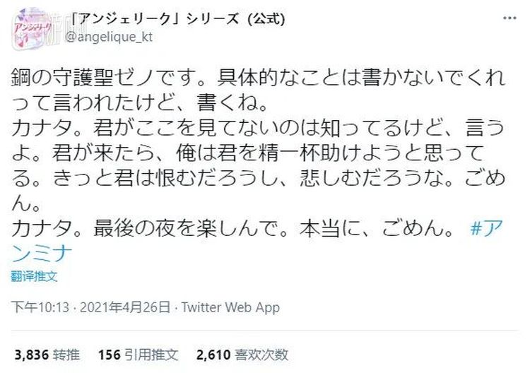 4月26日,游戏官推以另一名可攻略角色“杰诺”的口吻发推,让奏太享受最后一晚: