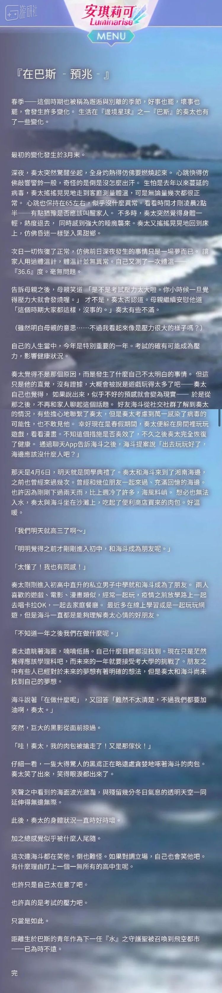 4月20日,游戏官网发布了一篇文章,介绍了可攻略角色“水之守护者奏太”被召唤前的故事。出生在“巴斯”星球的奏太,原本是名普通的高3学生,但他平静的生活在3月末出现了变化,先是身体异样却查不出原因,后来察觉有人跟踪自己。家人觉得他是考大学压力大产生的错觉,他只得和好友海斗倾诉。