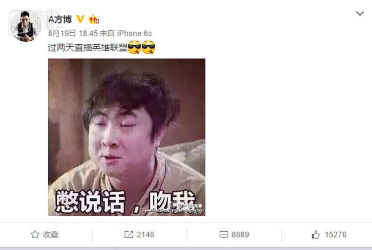 前两天方博发微博说要直播英雄联盟,还配了一张喜剧演员乔杉的影视截图。