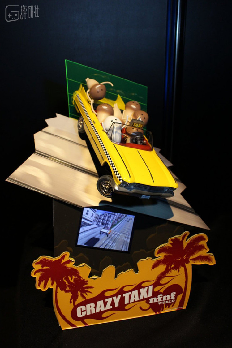 SEGA的另类驾驶游戏《疯狂出租车》和《触摸侦探》的小蘑菇同台献艺,也许是因为严重超载吧,车里的小蘑菇们的表情非常到位,在模型的下方还设置了一块小型液晶屏,里面播放着疯狂出租车的游戏展示画面,整体效果很不错。