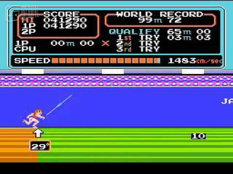 你以为像FC版那样,NES版的《田径》就是街机版《田径》的缩水版?那可真是太傻太天真了。看清楚,这游戏卖给的是精明能干的美国爸爸,不是傻白甜的日本玩家。你以为只有四个项目的缩水版游戏能糊弄得了山姆大叔吗?