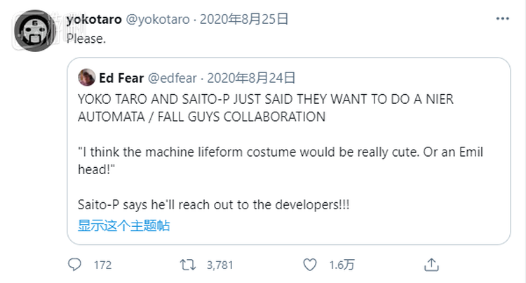到了2020年8月,《糖豆人:终极淘汰赛》红极一时,积极联动其他的流行影视及游戏作品,推出联动皮肤。这时的横尾太郎变得主动了许多,在推特上公开表达了想让《尼尔》系列和《糖豆人》联动的愿望。